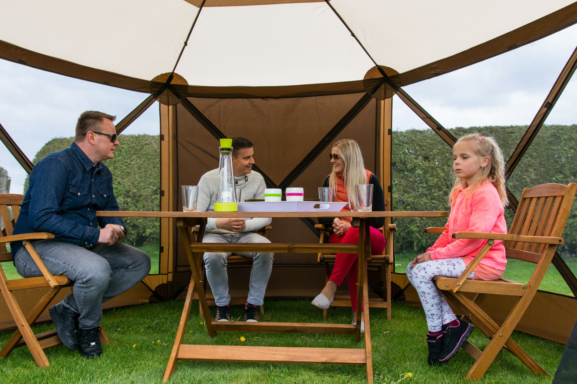 In dieser Camping-Überdachung finden 6 bis 8 Personen Platz – es hängt davon ab, welche Ausstattung Sie im Pavillon unterbringen möchten.